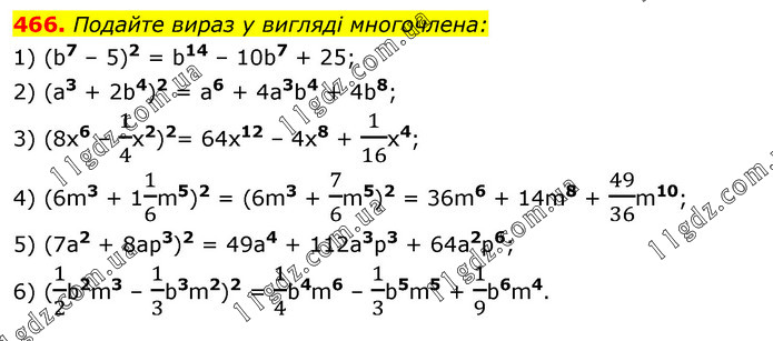 Подайте вираз у вигляді многочлена: 1) (b7 – 5)2 = b14 – 10b7 + 25; 2) (a3 + 2b4)2 = a6 + 4a3b4 + 4b8; 3) (8x6 – 1/4x2)2= 64x12 – 4x8 + 1/16x4; 4) (6m3 + 11/6m5)2 = (6m3 + 7/6m5)2 = 36m6 + 14m8 + 49/36m10; 5) (7a2 + 8ap3)2 = 49a4 + 112a3p3 + 64a2p6; 6) (1/2b2m3 – 1/3b3m2)2 = 1/4b4m6 – 1/3b5m5 + 1/9b6m4.