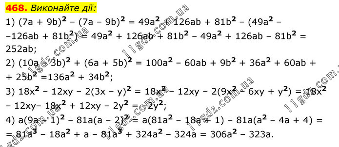 Виконайте дії: 1) (7a + 9b)2 – (7a – 9b)2 = 49a2 + 126ab + 81b2 – (49a2 – –126ab + 81b2) = 49a2 + 126ab + 81b2 – 49a2 + 126ab – 81b2 = 252ab; 2) (10a – 3b)2 + (6a + 5b)2 = 100a2 – 60ab + 9b2 + 36a2 + 60ab + + 25b2 =136a2 + 34b2; 3) 18x2 – 12xy – 2(3x – у)2 = 18x2 – 12ху – 2(9х2 – 6ху + у2) = 18x2 – 12xу– 18x2 + 12ху – 2y2 = –2у2; 4) a(9a – 1)2 – 81a(a – 2)2 = a(81a2 – 18a + 1) – 81a(a2 – 4a + 4) = = 81a3 – 18a2 + a – 81a3 + 324a2 – 324a = 306a2 – 323a.