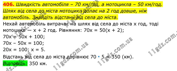 Швидкість автомобіля – 70 км/год, а мотоцикла – 50 км/год. Шлях від села до міста мотоцикл долає на 2 год довше, ніж автомобіль. Знайдіть відстань від села до міста. Нехай автомобіль витрачає на шлях від села до міста х год, тоді мотоцикл — х + 2 год. Рівняння: 70х = 50(х + 2); 70х = 50х + 100; 70х – 50х = 100; 20х = 100; х = 5. Відстань від села до міста дорівнює 70 ∙ 5 = 350 (км). Відповідь: 350 км.