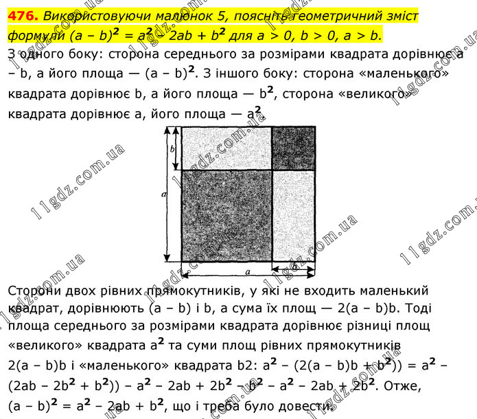 Використовуючи малюнок 5, поясніть геометричний зміст формули (а – b)2 = а2 – 2ab + b2 для а > 0, b > 0, а > b. З одного боку: сторона середнього за розмірами квадрата дорівнює а – b, а його площа — (a – b)2. З іншого боку: сторона «маленького» квадрата дорівнює b, а його площа — b2, сторона «великого» квадрата дорівнює а, його площа — a2. Сторони двох рівних прямокутників, у які не входить маленький квадрат, дорівнюють (а – b) і b, а сума їх площ — 2(а – b)b. Тоді площа середнього за розмірами квадрата дорівнює різниці площ «великого» квадрата а2 та суми площ рівних прямокутників 2(а – b)b і «маленького» квадрата b2: а2 – (2(а – b)b + b2)) = а2 – (2ab – 2b2 + b2)) – a2 – 2ab + 2b2 – b2 – a2 – 2ab + 2b2. Отже, (a – b)2 = a2 – 2ab + b2, що і треба було довести.