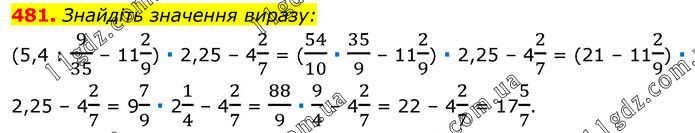 Знайдіть значення виразу: (5,4 : 9/35 – 112/9) ∙ 2,25 – 42/7 = (54/10 ∙ 35/9 – 112/9) ∙ 2,25 – 42/7 = (21 – 112/9) ∙ 2,25 – 42/7 = 97/9 ∙ 21/4 – 42/7 = 88/9 ∙ 9/4 – 42/7 = 22 – 42/7 = 175/7.