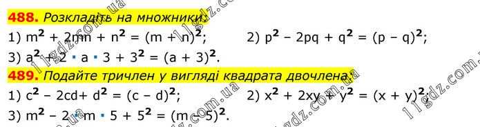 488. Розкладіть на множники: 1) m2 + 2mn + n2 = (m + n)2; 3) а2 + 2 ∙ а ∙ 3 + 32 = (a + 3)2. 2) р2 – 2pq + q2 = (р – q)2; 489. Подайте тричлен у вигляді квадрата двочлена: 1) с2 – 2cd+ d2 = (с – d)2; 3) m2 – 2 ∙ m ∙ 5 + 52 = (m – 5)2. 2) х2 + 2ху + у2 = (x + y)2;