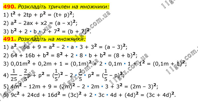 490. Розкладіть тричлен на множники: 1) t2 + 2tр + р2 = (t+ р)2; 2) а2 – 2ах + х2 = (a – х)2; 3) b2 + 2 ∙ b ∙ 7 + 72 = (b + 7)2. 491. Розкладіть на множники: 1) a2 – 6а + 9 = a2 – 2 ∙ a ∙ 3 + 32 = (a – 3)2; 2) 64 + 16b + b2 = 82 + 2 ∙ 8 ∙ b + b2 = (8 + b)2; 3) 0,01m2 + 0,2m + 1 = (0,1m)2 + 2 ∙ 0,1m ∙ 1 + 12 = (0,1m + 1)2; 4) 1/25 – 2/5p + p2 = (1/5)2 – 2 ∙ 1/5 ∙ p2 = (1/5 – p)2; 5) 4m2 – 12m + 9 = (2m)2 – 2 ∙ 2m ∙ 3 + 32 = (2m – 3)2; 6) 9c2 + 24cd + 16d2 = (3c)2 + 2 ∙ 3c ∙ 4d + (4d)2 = (3c + 4d)2.