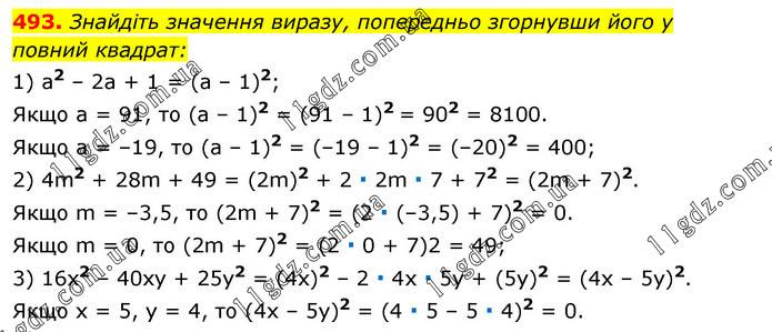 Знайдіть значення виразу, попередньо згорнувши його у повний квадрат: 1) a2 – 2a + 1 = (a – 1)2; Якщо a = 91, то (a – 1)2 = (91 – 1)2 = 902 = 8100. Якщо a = –19, то (a – 1)2 = (–19 – 1)2 = (–20)2 = 400; 2) 4m2 + 28m + 49 = (2m)2 + 2 ∙ 2m ∙ 7 + 72 = (2m + 7)2. Якщо m = –3,5, то (2m + 7)2 = (2 ∙ (–3,5) + 7)2 = 0. Якщо m = 0, то (2m + 7)2 = (2 ∙ 0 + 7)2 = 49; 3) 16x2 – 40xy + 25y2 = (4x)2 – 2 ∙ 4x ∙ 5y + (5y)2 = (4x – 5y)2. Якщо x = 5, у = 4, то (4x – 5у)2 = (4 ∙ 5 – 5 ∙ 4)2 = 0.