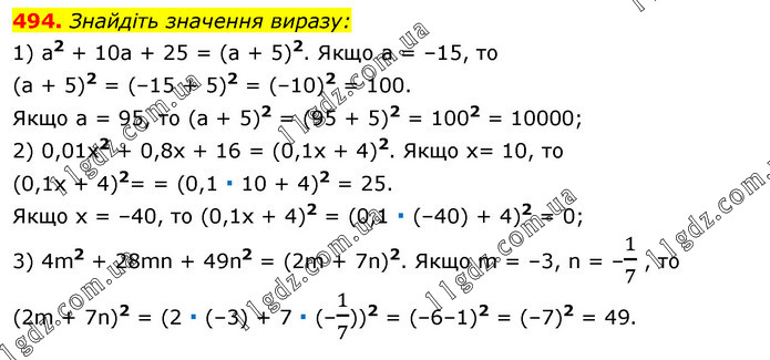 Знайдіть значення виразу: 1) а2 + 10a + 25 = (а + 5)2. Якщо а = –15, то (а + 5)2 = (–15 + 5)2 = (–10)2 = 100. Якщо а = 95, то (a + 5)2 = (95 + 5)2 = 1002 = 10000; 2) 0,01x2 + 0,8x + 16 = (0,1x + 4)2. Якщо х= 10, то (0,1x + 4)2= = (0,1 ∙ 10 + 4)2 = 25. Якщо х = –40, то (0,1x + 4)2 = (0,1 ∙ (–40) + 4)2 = 0; 3) 4m2 + 28mn + 49n2 = (2m + 7n)2. Якщо m = –3, n = –1/7 , то (2m + 7n)2 = (2 ∙ (–3) + 7 ∙ (–1/7))2 = (–6–1)2 = (–7)2 = 49.