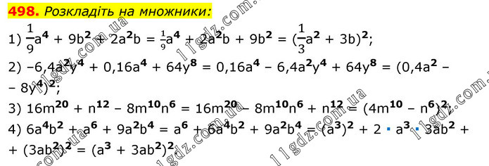 Розкладіть на множники: 1) 1/9a4 + 9b2 + 2a2b = 1/9a4 + 2a2b + 9b2 = (1/3a2 + 3b)2; 2) –6,4a2y4 + 0,16a4 + 64y8 = 0,16a4 – 6,4a2y4 + 64y8 = (0,4a2 – – 8y4)2; 3) 16m20 + n12 – 8m10n6 = 16m20 – 8m10n6 + n12 = (4m10 – n6)2; 4) 6a4b2 + a6 + 9a2b4 = a6 + 6a4b2 + 9a2b4 = (a3)2 + 2 ∙ a3 ∙ 3ab2 + + (3ab2)2 = (a3 + 3ab2)2.