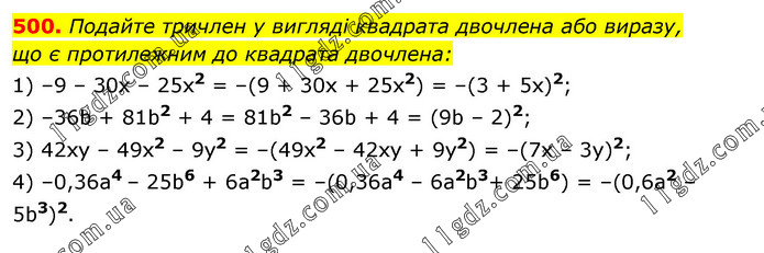 Подайте тричлен у вигляді квадрата двочлена або виразу, що є протилежним до квадрата двочлена: 1) –9 – 30x – 25x2 = –(9 + 30x + 25x2) = –(3 + 5x)2; 2) –36b + 81b2 + 4 = 81b2 – 36b + 4 = (9b – 2)2; 3) 42xy – 49x2 – 9y2 = –(49x2 – 42xy + 9y2) = –(7x – 3y)2; 4) –0,36a4 – 25b6 + 6a2b3 = –(0,36a4 – 6a2b3+ 25b6) = –(0,6a2 – 5b3)2.