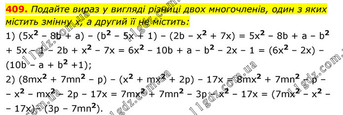 Подайте вираз у вигляді різниці двох многочленів, один з яких містить змінну х, а другий її не містить: 1) (5х2 – 8b + a) – (b2 – 5х + 1) – (2b – x2 + 7х) = 5х2 – 8b + а – b2 + 5х – 1 – 2b + x2 – 7х = 6х2 – 10b + а – b2 – 2х – 1 = (6х2 – 2х) – (10b – а + b2 +1); 2) (8mx2 + 7mn2 – p) – (x2 + mx2 + 2p) – 17x = 8mx2 + 7mn2 – p – – x2 – mx2 – 2p – 17x = 7mx2 + 7mn2 – 3p – x2 – 17x = (7mx2 – x2 – – 17x)– (3p – 7mn2).