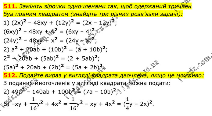 511. Замініть зірочки одночленами так, щоб одержаний тричлен був повним квадратом (знайдіть три різних розв’язки задачі): 1) (2х)2 – 48ху + (12у)2 = (2х – 12у)2; (6ху)2 – 48ху + 42 = (6ху – 4)2; (24у)2 – 48ху + x2 = (24у – х)2; 2) а2 + 20ab + (10b)2 = (а + 10b)2; 22 + 20ab + (5ab)2 = (2 + 5ab)2; (5а)2 + 20ab + (2b)2 = (5a + 2b)2. 512. Подайте вираз у вигляді квадрата двочлена, якщо це можливо: З поданих многочленів у вигляді квадрата можна подати: 2) 49a2 – 140ab + 100b2 = (7а – 10b)2; 6) –ху + 1/16y2 + 4х2 = 1/16y2 – ху + 4х2 = (1/4y – 2x)2.