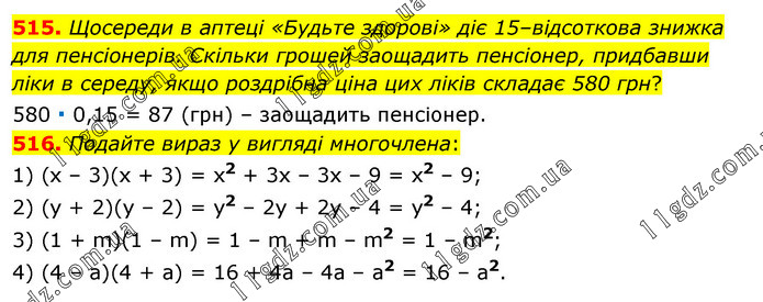 515. Щосереди в аптеці «Будьте здорові» діє 15–відсоткова знижка для пенсіонерів. Скільки грошей заощадить пенсіонер, придбавши ліки в середу, якщо роздрібна ціна цих ліків складає 580 грн? 580 ∙ 0,15 = 87 (грн) – заощадить пенсіонер. 516. Подайте вираз у вигляді многочлена: 1) (х – 3)(х + 3) = x2 + 3x – 3x – 9 = x2 – 9; 2) (у + 2)(у – 2) = y2 – 2y + 2y – 4 = y2 – 4; 3) (1 + m)(1 – m) = 1 – m + m – m2 = 1 – m2; 4) (4 – а)(4 + а) = 16 + 4a – 4a – a2 = 16 – a2.