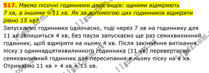 Маємо пісочні годинники двох видів: одними відміряють 7 хв, а іншими – 11 хв. Як за допомогою цих годинників відміряти рівно 15 хв? Запускаємо годинники одночасно, тоді через 7 хв на годиннику для 11 хв залишиться 4 хв, без паузи запускаємо ще раз семихвилинний годинник, щоб відміряти на ньому 4 хв. Після закінчення витікання піску з одиннадцятихвилинного годинника (11 хв) перевертаємо семихвилинний годинник для пересипання в ньому піску на 4 хв. Отримаємо 11 хв + 4 хв = 15 хв.