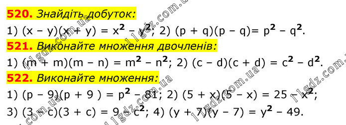 520. Знайдіть добуток: 1) (х – у)(х + у) = х2 – у2; 2) (р + q)(p – q)= р2 – q2. 521. Виконайте множення двочленів: 1) (m + m)(m – n) = m2 – n2; 2) (с – d)(c + d) = с2 – d2. 522. Виконайте множення: 1) (р – 9)(р + 9 ) = р2 – 81; 2) (5 + х)(5 – х) = 25 – х2; 3) (3 – с)(3 + с) = 9 – с2; 4) (у + 7)(y – 7) = у2 – 49.