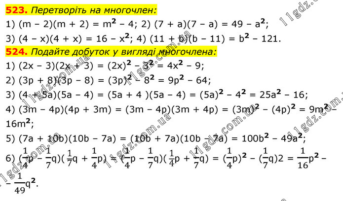 523. Перетворіть на многочлен: 1) (m – 2)(m + 2) = m2 – 4; 2) (7 + а)(7 – а) = 49 – a2; 3) (4 – х)(4 + х) = 16 – x2; 4) (11 + b)(b – 11) = b2 – 121. 524. Подайте добуток у вигляді многочлена: 1) (2х – 3)(2х + 3) = (2х)2 – 32 = 4х2 – 9; 2) (3р + 8)(3р – 8) = (3р)2 – 82 = 9р2 – 64; 3) (4 + 5а)(5a – 4) = (5a + 4 )(5а – 4) = (5a)2 – 42 = 25а2 – 16; 4) (3m – 4р)(4р + 3m) = (3m – 4р)(3m + 4р) = (3m)2 – (4р)2 = 9m2 – 16m2; 5) (7а + 10b)(10b – 7а) = (10b + 7a)(10b – 7a) = 100b2 – 49a2; 6) (1/4p – 1/7q)( 1/7q + 1/4p) = (1/4p – 1/7q)( 1/4p + 1/7q) = (1/4p)2 – (1/7q)2 = 1/16p2 – – 1/49q2.