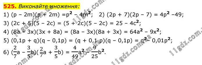 Виконайте множення: 1) (р – 2m)(р + 2m) =р2 – 4m2; 2) (2р + 7)(2р – 7) = 4р2 –49; 3) (2с + 5)(5 – 2с) = (5 + 2с)(5 – 2с) = 25 – 4с2; 4) (8а – 3х)(3х + 8a) = (8a – 3х)(8a + 3х) = 64a2 – 9х2; 5) (0,1р + q)(q – 0,1р) = (q + 0,1 p)(q – 0,1р) = q2– 0,01р2; 6) (2/7a – 3/5b)( 2/7a + 3/5b) = 4/49a2 – 9/25b2.