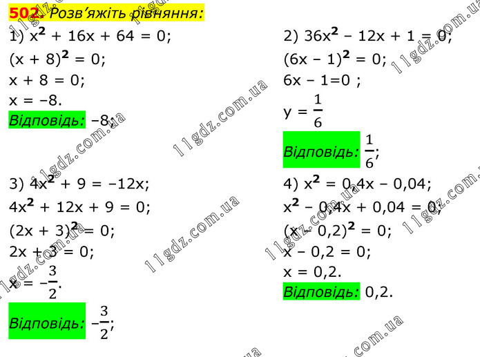 Розв’яжіть рівняння: 1) x2 + 16x + 64 = 0; (x + 8)2 = 0; x + 8 = 0; x = –8. Відповідь: –8; 2) 36x2 – 12x + 1 = 0; (6x – 1)2 = 0; 6х – 1=0 ; y = 1/6 Відповідь: 1/6; 3) 4x2 + 9 = –12x; 4х2 + 12х + 9 = 0; (2х + 3)2 = 0; 2х + 3 = 0; х = –3/2. Відповідь: –3/2; 4) х2 = 0,4х – 0,04; х2 – 0,4х + 0,04 = 0; (х – 0,2)2 = 0; х – 0,2 = 0; х = 0,2. Відповідь: 0,2.