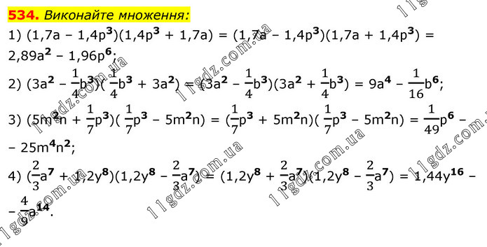Виконайте множення: 1) (1,7а – 1,4p3)(1,4p3 + 1,7а) = (1,7а – 1,4p3)(1,7а + 1,4p3) = 2,89а2 – 1,96p6; 2) (3a2 – 1/4b3)( 1/4b3 + 3a2) = (3a2 – 1/4b3)(3a2 + 1/4b3) = 9a4 – 1/16b6; 3) (5m2n + 1/7p3)( 1/7p3 – 5m2n) = (1/7p3 + 5m2n)( 1/7p3 – 5m2n) = 1/49p6 – – 25m4n2; 4) (2/3a7 + 1,2y8)(1,2y8 – 2/3a7) = (1,2y8 + 2/3a7)(1,2y8 – 2/3a7) = 1,44y16 – – 4/9a14.