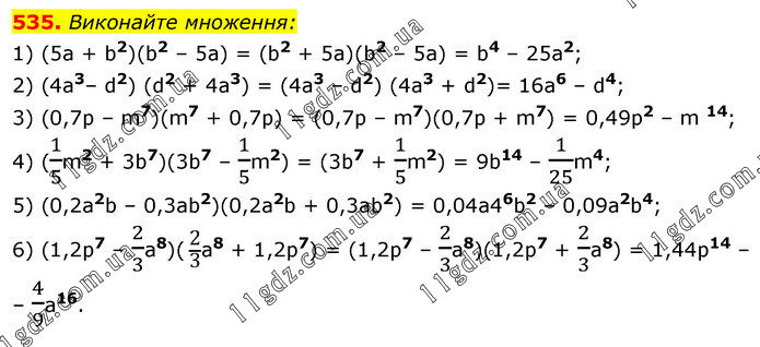 Виконайте множення: 1) (5а + b2)(b2 – 5а) = (b2 + 5а)(b2 – 5а) = b4 – 25а2; 2) (4а3– d2) (d2 + 4а3) = (4а3 – d2) (4а3 + d2)= 16а6 – d4; 3) (0,7р – m7)(m7 + 0,7p) = (0,7р – m7)(0,7р + m7) = 0,49p2 – m 14; 4) (1/5m2 + 3b7)(3b7 – 1/5m2) = (3b7 + 1/5m2) = 9b14 – 1/25m4; 5) (0,2а2b – 0,3аb2)(0,2а2b + 0,3аb2) = 0,04а46b2 – 0,09а2b4; 6) (1,2p7 – 2/3a8)( 2/3a8 + 1,2p7) = (1,2p7 – 2/3a8)(1,2p7 + 2/3a8) = 1,44p14 – – 4/9a16.