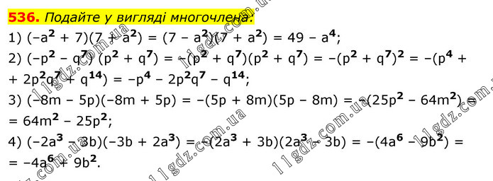 Подайте у вигляді многочлена: 1) (–а2 + 7)(7 + а2) = (7 – а2)(7 + а2) = 49 – а4; 2) (–p2 – q7) (p2 + q7) = –(p2 + q7)(p2 + q7) = –(p2 + q7)2 = –(p4 + + 2p2q7 + q14) = –p4 – 2p2q7 – q14; 3) (–8m – 5p)(–8m + 5p) = –(5p + 8m)(5p – 8m) = –(25p2 – 64m2) = = 64m2 – 25p2; 4) (–2а3 – 3b)(–3b + 2а3) = –(2а3 + 3b)(2а3 – 3b) = –(4а6 – 9b2) = = –4а6 + 9b2.