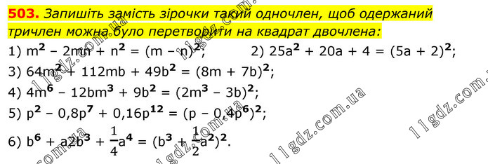 Запишіть замість зірочки такий одночлен, щоб одержаний тричлен можна було перетворити на квадрат двочлена: 1) m2 – 2mn + n2 = (m – n)2; 2) 25а2 + 20а + 4 = (5а + 2)2; 3) 64m2 + 112mb + 49b2 = (8m + 7b)2; 4) 4m6 – 12bm3 + 9b2 = (2m3 – 3b)2; 5) р2 – 0,8p7 + 0,16р12 = (р – 0,4p6)2; 6) b6 + a2b3 + 1/4a4 = (b3 + 1/2а2)2.
