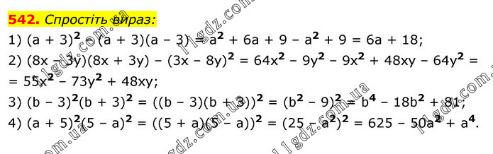 Спростіть вираз: 1) (а + 3)2 – (a + 3)(a – 3) = a2 + 6a + 9 – a2 + 9 = 6a + 18; 2) (8х – 3у)(8х + 3у) – (3х – 8у)2 = 64x2 – 9y2 – 9х2 + 48xy – 64y2 = = 55x2 – 73y2 + 48ху; 3) (b – 3)2(b + 3)2 = ((b – 3)(b + З))2 = (b2 – 9)2 = b4 – 18b2 + 81; 4) (а + 5)2(5 – а)2 = ((5 + a)(5 – а))2 = (25 – а2)2 = 625 – 50а2 + а4.