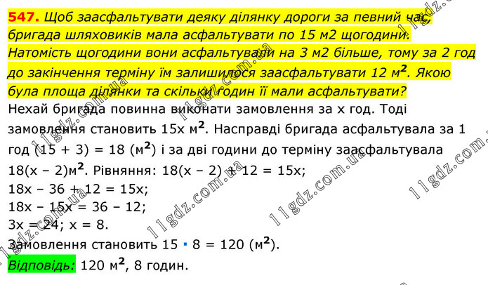 Щоб заасфальтувати деяку ділянку дороги за певний час, бригада шляховиків мала асфальтувати по 15 м2 щогодини. Натомість щогодини вони асфальтували на 3 м2 більше, тому за 2 год до закінчення терміну їм залишилося заасфальтувати 12 м2. Якою була площа ділянки та скільки годин її мали асфальтувати? Нехай бригада повинна виконати замовлення за х год. Тоді замовлення становить 15х м2. Насправді бригада асфальтувала за 1 год (15 + 3) = 18 (м2) і за дві години до терміну заасфальтувала 18(х – 2)м2. Рівняння: 18(х – 2) + 12 = 15х; 18х – 36 + 12 = 15х; 18x – 15х = 36 – 12; 3х = 24; х = 8. Замовлення становить 15 ∙ 8 = 120 (м2). Відповідь: 120 м2, 8 годин.