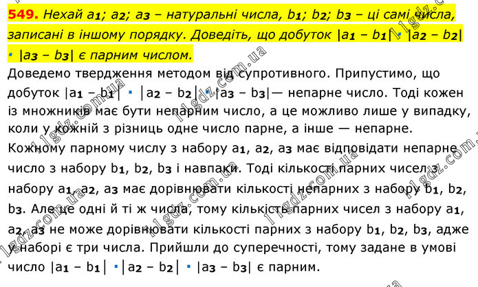 Нехай a1; а2; а3 – натуральні числа, b1; b2; b3 – ці самі числа, записані в іншому порядку. Доведіть, що добуток |a1 – b1| ∙ |a2 – b2| ∙ |а3 – b3| є парним числом. Доведемо твердження методом від супротивного. Припустимо, що добуток |а1 – b1│ ∙ │а2 – b2│ ∙ |a3 – b3|— непарне число. Тоді кожен із множників має бути непарним число, а це можливо лише у випадку, коли у кожній з різниць одне число парне, а інше — непарне. Кожному парному числу з набору а1, а2, a3 має відповідати непарне число з набору b1, b2, b3 і навпаки. Тоді кількості парних чисел з набору а1, а2, а3 має дорівнювати кількості непарних з набору b1, b2, b3. Але це одні й ті ж числа, тому кількість парних чисел з набору а1, а2, а3 не може дорівнювати кількості парних з набору b1, b2, b3, адже у наборі є три числа. Прийшли до суперечності, тому задане в умові число |а1 – b1│ ∙│а2 – b2│ ∙ |a3 – b3| є парним.