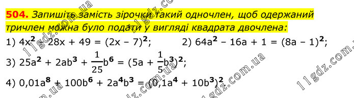 Запишіть замість зірочки такий одночлен, щоб одержаний тричлен можна було подати у вигляді квадрата двочлена: 1) 4x2 – 28х + 49 = (2х – 7)2; 2) 64а2 – 16а + 1 = (8а – 1)2; 3) 25а2 + 2ab3 + 1/25b6 = (5a + 1/5b3)2; 4) 0,01а8 + 100b6 + 2a4b3 = (0,1а4 + 10b3)2.
