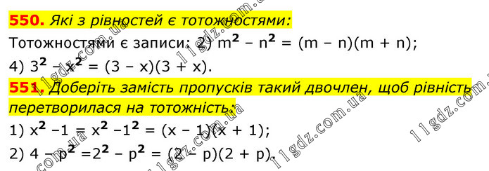 550. Які з рівностей є тотожностями: Тотожностями є записи: 2) m2 – n2 = (m – n)(m + n); 4) 32 – х2 = (3 – х)(3 + х). 551. Доберіть замість пропусків такий двочлен, щоб рівність перетворилася на тотожність: 1) x2 –1 = x2 –12 = (х – 1)(x + 1); 2) 4 – р2 =22 – р2 = (2 – р)(2 + р).