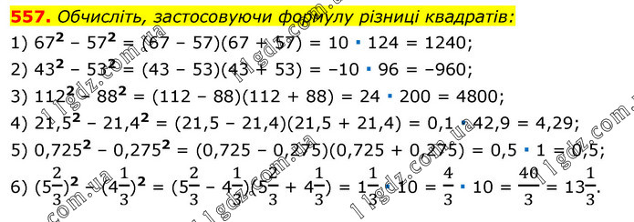 Обчисліть, застосовуючи формулу різниці квадратів: 1) 672 – 572 = (67 – 57)(67 + 57) = 10 ∙ 124 = 1240; 2) 432 – 532 = (43 – 53)(43 + 53) = –10 ∙ 96 = –960; 3) 1122 – 882 = (112 – 88)(112 + 88) = 24 ∙ 200 = 4800; 4) 21,52 – 21,42 = (21,5 – 21,4)(21,5 + 21,4) = 0,1 ∙ 42,9 = 4,29; 5) 0,7252 – 0,2752 = (0,725 – 0,275)(0,725 + 0,275) = 0,5 ∙ 1 = 0,5; 6) (52/3)2 – (41/3)2 = (52/3 – 41/3)(52/3 + 41/3) = 11/3 ∙ 10 = 4/3 ∙ 10 = 40/3 = 131/3.