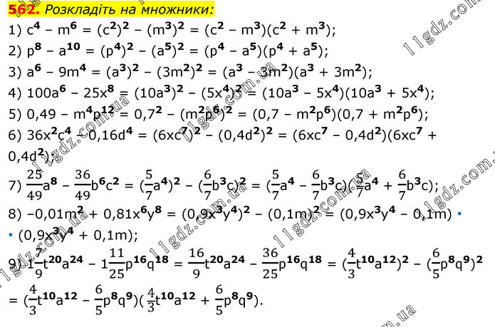 Розкладіть на множники: 1) с4 – m6 = (с2)2 – (m3)2 = (с2 – m3)(с2 + m3); 2) p8 – a10 = (р4)2 – (a5)2 = (р4 – a5)(р4 + a5); 3) a6 – 9m4 = (a3)2 – (3m2)2 = (a3 – 3m2)(a3 + 3m2); 4) 100a6 – 25х8 = (10a3)2 – (5х4)2 = (10a3 – 5х4)(10a3 + 5х4); 5) 0,49 – m4p12 = 0,72 – (m2р6)2 = (0,7 – m2p6)(0,7 + m2р6); 6) 36х2c4 – 0,16d4 = (6хс7)2 – (0,4d2)2 = (6хс7 – 0,4d2)(6хс7 + 0,4d2); 7) 25/49a8 – 36/49b6c2 = (5/7a4)2 – (6/7b3c)2 = (5/7a4 – 6/7b3c)( 5/7a4 + 6/7b3c); 8) –0,01m2 + 0,81x6y8 = (0,9х3y4)2 – (0,1m)2 = (0,9х3у4 – 0,1m) ∙ ∙ (0,9х3y4 + 0,1m); 9) 17/9t20a24 – 111/25p16q18 = 16/9t20a24 – 36/25p16q18 = (4/3t10a12)2 – (6/5p8q9)2 = (4/3t10a12 – 6/5p8q9)( 4/3t10a12 + 6/5p8q9).