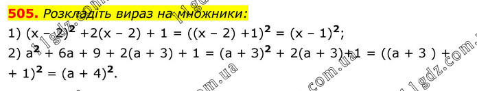 Розкладіть вираз на множники: 1) (х – 2)2 +2(х – 2) + 1 = ((х – 2) +1)2 = (х – 1)2; 2) а2 + 6а + 9 + 2(а + 3) + 1 = (а + З)2 + 2(а + 3)+1 = ((а + 3 ) + + 1)2 = (а + 4)2.