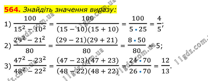 Знайдіть значення виразу: 1) 100/(15^2 - 10^2 ) = 100/((15 - 10)(15 + 10)) = 100/(5 • 25) = 4/5; 2) (29^2 - 21^2)/80 = ((29 - 21)(29 + 21))/80 = (8 • 50)/80 = 5; 3) (47^2 - 23^2)/(48^2 - 22^2 ) = ((47 - 23)(47 + 23))/((48 - 22)(48 + 22)) = (24 • 70)/(26 • 70) = 12/13.