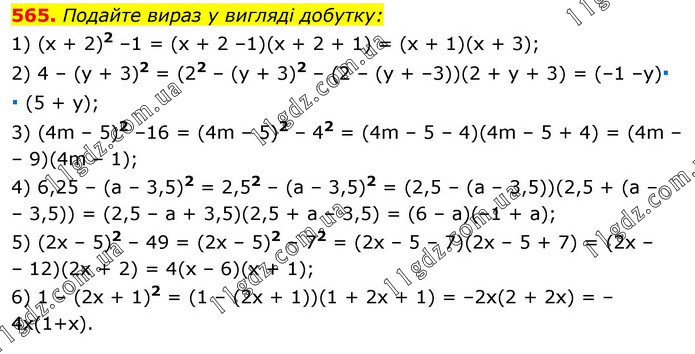 Подайте вираз у вигляді добутку: 1) (x + 2)2 –1 = (x + 2 –1)(х + 2 + 1) = (х + 1)(х + 3); 2) 4 – (у + 3)2 = (22 – (у + 3)2 – (2 – (у + –3))(2 + у + 3) = (–1 –у)∙ ∙ (5 + у); 3) (4m – 5)2 –16 = (4m – 5)2 – 42 = (4m – 5 – 4)(4m – 5 + 4) = (4m – – 9)(4m – 1); 4) 6,25 – (а – 3,5)2 = 2,52 – (а – 3,5)2 = (2,5 – (а – 3,5))(2,5 + (а – – 3,5)) = (2,5 – а + 3,5)(2,5 + а – 3,5) = (6 – а)(–1 + а); 5) (2х – 5)2 – 49 = (2x – 5)2 – 72 = (2x – 5 – 7)(2х – 5 + 7) = (2х – – 12)(2х + 2) = 4(х – 6)(х + 1); 6) 1 – (2х + 1)2 = (1 – (2х + 1))(1 + 2х + 1) = –2х(2 + 2х) = –4х(1+х).