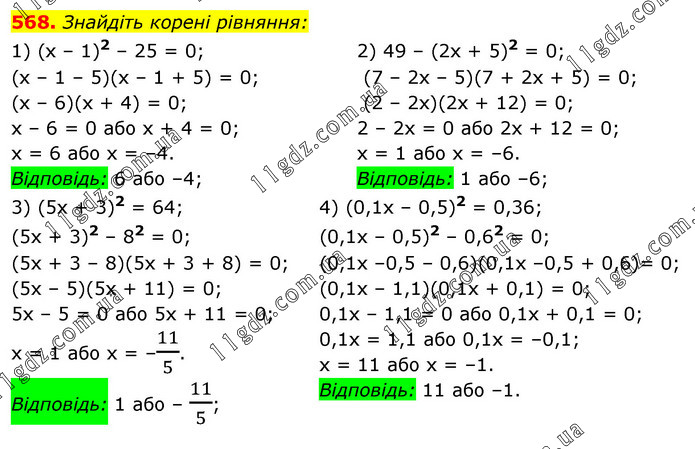 Знайдіть корені рівняння: 1) (х – 1)2 – 25 = 0; (х – 1 – 5)(х – 1 + 5) = 0; (х – 6)(х + 4) = 0; х – 6 = 0 або х + 4 = 0; х = 6 або х = –4. Відповідь: 6 або –4; 2) 49 – (2х + 5)2 = 0; (7 – 2х – 5)(7 + 2х + 5) = 0; (2 – 2х)(2х + 12) = 0; 2 – 2х = 0 або 2х + 12 = 0; х = 1 або х = –6. Відповідь: 1 або –6; 3) (5х + 3)2 = 64; (5х + 3)2 – 82 = 0; (5х + 3 – 8)(5х + 3 + 8) = 0; (5х – 5)(5х + 11) = 0; 5х – 5 = 0 або 5х + 11 = 0; х = 1 або х = –11/5. Відповідь: 1 або – 11/5; 4) (0,1x – 0,5)2 = 0,36; (0,1x – 0,5)2 – 0,62 = 0; (0,1x –0,5 – 0,6)(0,1x –0,5 + 0,6)= 0; (0,1х – 1,1)(0,1x + 0,1) = 0; 0,1х – 1,1 = 0 або 0,1х + 0,1 = 0; 0,1х = 1,1 або 0,1x = –0,1; х = 11 або х = –1. Відповідь: 11 або –1.
