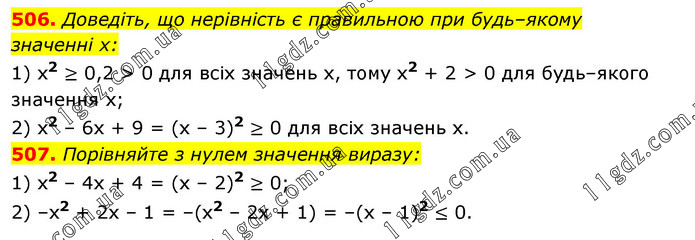 506. Доведіть, що нерівність є правильною при будь–якому значенні х: 1) x2 ≥ 0,2 > 0 для всіх значень х, тому х2 + 2 > 0 для будь–якого значення х; 2) x2 – 6х + 9 = (х – 3)2 ≥ 0 для всіх значень х. 507. Порівняйте з нулем значення виразу: 1) x2 – 4х + 4 = (х – 2)2 ≥ 0; 2) –x2 + 2х – 1 = –(х2 – 2х + 1) = –(х – 1)2 ≤ 0.