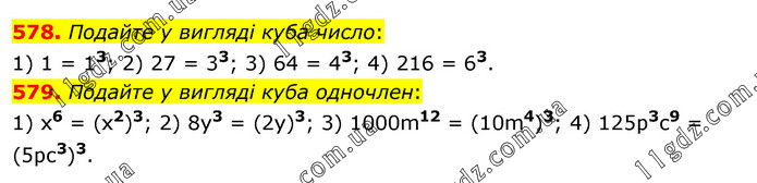 578. Подайте у вигляді куба число: 1) 1 = 13; 2) 27 = 33; 3) 64 = 43; 4) 216 = 63. 579. Подайте у вигляді куба одночлен: 1) х6 = (х2)3; 2) 8у3 = (2у)3; 3) 1000m12 = (10m4)3; 4) 125p3c9 = (5pс3)3.