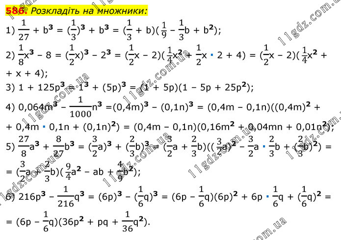 Розкладіть на множники: 1) 1/27 + b3 = (1/3)3 + b3 = (1/3 + b)( 1/9 – 1/3b + b2); 2) 1/8x3 – 8 = (1/2x)3 – 23 = (1/2x – 2)( 1/4x2 + 1/2x ∙ 2 + 4) = (1/2x – 2)( 1/4x2 + + x + 4); 3) 1 + 125p3 = 13 + (5р)3 = (1 + 5p)(1 – 5p + 25р2); 4) 0,064m3 – 1/1000n3 =(0,4m)3 – (0,1n)3 = (0,4m – 0,1n)((0,4m)2 + + 0,4m ∙ 0,1n + (0,1n)2) = (0,4m – 0,1n)(0,16m2 + 0,04mn + 0,01n2); 5) 27/8a3 + 8/27b3 = (3/2a)3 + (2/3b)3 = (3/2a + 2/3b)(( 3/2a)2 – 3/2a ∙ 2/3b + (2/3b)2) = = (3/2a + 2/3b)( 9/4a2 – ab + 4/9b2); 6) 216p3 – 1/216q3 = (6p)3 – (1/6q)3 = (6p – 1/6q)(6p)2 + 6p ∙ 1/6q + (1/6q)2 = = (6p – 1/6q)(36p2 + pq + 1/36q2).