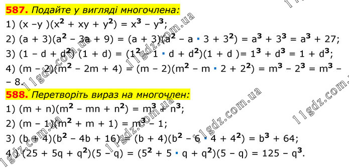 587. Подайте у вигляді многочлена: 1) (х –у )(х2 + ху + y2) = x3 – y3; 2) (а + 3)(а2 – 3а + 9) = (а + 3)(а2 – а ∙ 3 + 32) = а3 + 33 = а3 + 27; 3) (1 – d + d2) (1 + d) = (12 – 1 ∙ d + d2)(1 + d )= 13 + d3 = 1 + d3; 4) (m – 2)(m2 – 2m + 4) = (m – 2)(m2 – m ∙ 2 + 22) = m3 – 23 = m3 – – 8. 588. Перетворіть вираз на многочлен: 1) (m + n)(m2 – mn + n2) = m3 + n3; 2) (m – 1)(m2 + m + 1) = m3 – 1; 3) (b + 4)(b2 – 4b + 16) = (b + 4)(b2 – 6 ∙ 4 + 42) = b3 + 64; 4 ) (25 + 5q + q2)(5 – q) = (52 + 5 ∙ q + q2)(5 – q) = 125 – q3.