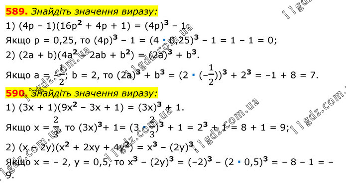 589. Знайдіть значення виразу: 1) (4p – 1)(16p2 + 4p + 1) = (4p)3 – 1. Якщо p = 0,25, то (4p)3 – 1 = (4 ∙ 0,25)3 – 1 = 1 – 1 = 0; 2) (2a + b)(4a2 – 2ab + b2) = (2a)3 + b3. Якщо а = –1/2; b = 2, то (2a)3 + b3 = (2 ∙ (–1/2))3 + 23 = –1 + 8 = 7. 590. Знайдіть значення виразу: 1) (3x + 1)(9x2 – 3x + 1) = (3х)3 + 1. Якщо х = 2/3, то (3х)3+ 1= (3 ∙ 2/3)3 + 1 = 23 + 1 = 8 + 1 = 9; 2) (x – 2y)(x2 + 2xy + 4y2) = x3 – (2y)3. Якщо x = – 2, у = 0,5, то x3 – (2y)3 = (–2)3 – (2 ∙ 0,5)3 = – 8 – 1 = – 9.