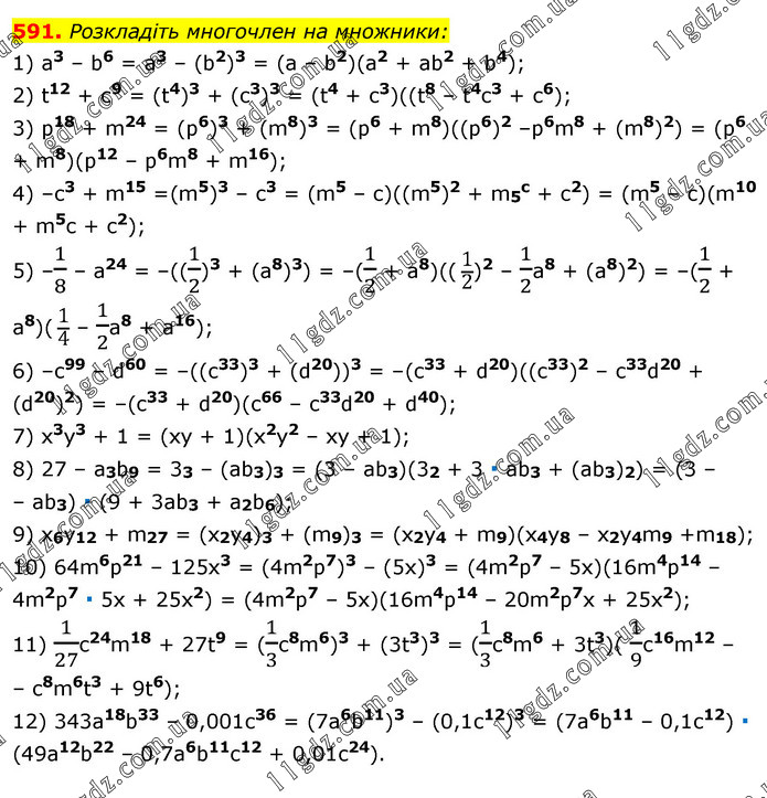 Розкладіть многочлен на множники: 1) a3 – b6 = a3 – (b2)3 = (a – b2)(a2 + ab2 + b4); 2) t12 + c9 = (t4)3 + (c3)3 = (t4 + c3)((t8 – t4c3 + c6); 3) p18 + m24 = (p6)3 + (m8)3 = (p6 + m8)((p6)2 –р6m8 + (m8)2) = (p6 + m8)(p12 – p6m8 + m16); 4) –c3 + m15 =(m5)3 – c3 = (m5 – c)((m5)2 + m5c + c2) = (m5 – c)(m10 + m5c + c2); 5) –1/8 – a24 = –((1/2)3 + (a8)3) = –(1/2 + a8)(( 1/2)2 – 1/2a8 + (a8)2) = –(1/2 + a8)( 1/4 – 1/2a8 + a16); 6) –c99 – d60 = –((c33)3 + (d20))3 = –(c33 + d20)((c33)2 – c33d20 + (d20)2) = –(c33 + d20)(c66 – c33d20 + d40); 7) x3y3 + 1 = (xy + 1)(x2y2 – xy + 1); 8) 27 – a3b9 = 33 – (ab3)3 = (3 – ab3)(32 + 3 ∙ ab3 + (ab3)2) = (3 – – ab3) ∙ (9 + 3аb3 + a2b6); 9) x6y12 + m27 = (x2y4)3 + (m9)3 = (x2y4 + m9)(x4y8 – x2y4m9 +m18); 10) 64m6p21 – 125x3 = (4m2p7)3 – (5x)3 = (4m2р7 – 5х)(16m4p14 – 4m2p7 ∙ 5x + 25x2) = (4m2p7 – 5x)(16m4p14 – 20m2p7x + 25x2); 11) 1/27c24m18 + 27t9 = (1/3c8m6)3 + (3t3)3 = (1/3c8m6 + 3t3)( 1/9c16m12 – – c8m6t3 + 9t6); 12) 343a18b33 – 0,001c36 = (7a6b11)3 – (0,1c12)3 = (7a6b11 – 0,1c12) ∙ (49a12b22 – 0,7a6b11c12 + 0,01c24).