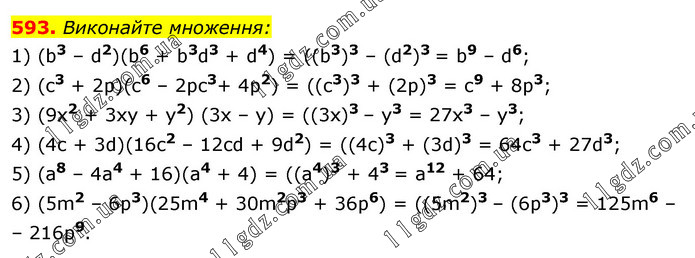 Виконайте множення: 1) (b3 – d2)(b6 + b3d3 + d4) = ((b3)3 – (d2)3 = b9 – d6; 2) (c3 + 2p)(c6 – 2pc3+ 4p2) = ((c3)3 + (2p)3 = c9 + 8p3; 3) (9x2 + 3xy + y2) (3x – y) = ((3x)3 – y3 = 27x3 – y3; 4) (4c + 3d)(16c2 – 12cd + 9d2) = ((4c)3 + (3d)3 = 64c3 + 27d3; 5) (a8 – 4a4 + 16)(a4 + 4) = ((a4)3 + 43 = a12 + 64; 6) (5m2 – 6р3)(25m4 + 30m2p3 + 36p6) = ((5m2)3 – (6p3)3 = 125m6 – – 216p9.