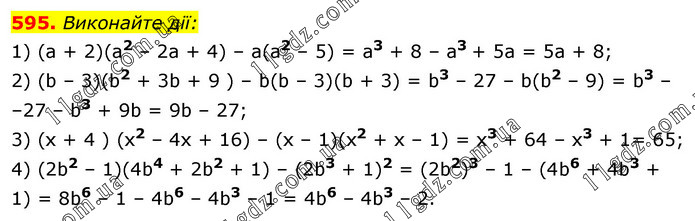 Виконайте дії: 1) (а + 2)(а2 – 2а + 4) – a(а2 – 5) = а3 + 8 – а3 + 5а = 5а + 8; 2) (b – 3)(b2 + 3b + 9 ) – b(b – 3)(b + 3) = b3 – 27 – b(b2 – 9) = b3 – –27 – b3 + 9b = 9b – 27; 3) (х + 4 ) (x2 – 4х + 16) – (х – 1)(x2 + x – 1) = х3 + 64 – х3 + 1= 65; 4) (2b2 – 1)(4b4 + 2b2 + 1) – (2b3 + 1)2 = (2b2)3 – 1 – (4b6 + 4b3 + 1) = 8b6 – 1 – 4b6 – 4b3 – 1 = 4b6 – 4b3 – 2.