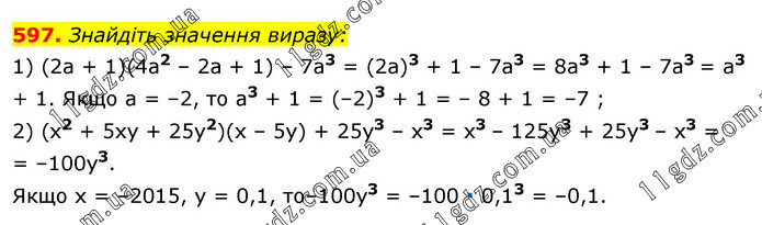 Знайдіть значення виразу: 1) (2а + 1)(4a2 – 2а + 1) – 7а3 = (2а)3 + 1 – 7а3 = 8а3 + 1 – 7а3 = а3 + 1. Якщо а = –2, то a3 + 1 = (–2)3 + 1 = – 8 + 1 = –7 ; 2) (х2 + 5ху + 25y2)(х – 5у) + 25y3 – х3 = х3 – 125y3 + 25y3 – х3 = = –100y3. Якщо х = –2015, y = 0,1, то–100y3 = –100 ∙ 0,13 = –0,1.