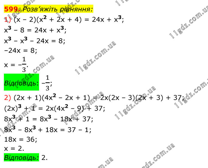 Розв’яжіть рівняння: 1) (х – 2)(х2 + 2х + 4) = 24х + x3; x3 – 8 = 24х + х3; х3 – х3 – 24х = 8; –24х = 8; x = –1/3. Відповідь: –1/3; 2) (2х + 1)(4х2 – 2х + 1) = 2х(2х – 3)(2х + 3) + 37; (2х)3 + 1 = 2х(4х2 – 9) + 37; 8x3 + 1 = 8x3 – 18x + 37; 8х3 – 8х3 + 18х = 37 – 1; 18x = 36; х = 2.