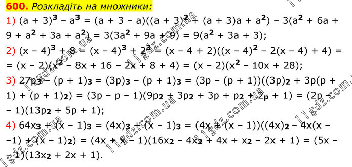 Розкладіть на множники: 1) (а + 3)3 – а3 = (а + 3 – а)((а + 3)2 + (а + 3)а + а2) – 3(а2 + 6а + 9 + а2 + 3а + а2) = 3(3а2 + 9а + 9) = 9(а2 + 3а + 3); 2) (х – 4)3 + 8 = (х – 4)3 + 23 = (х – 4 + 2)((х – 4)2 – 2(х – 4) + 4) = = (х – 2)(х2 – 8х + 16 – 2х + 8 + 4) = (х – 2)(х2 – 10x + 28); 3) 27р3 – (р + 1)3 = (3р)3 – (р + 1)3 = (3р – (р + 1))((3р)2 + 3р(р + 1) + (р + 1)2) = (3р – р – 1)(9р2 + 3р2 + 3р + р2 + 2р + 1) = (2р – – 1)(13р2 + 5р + 1); 4) 64x3 + (х – 1)3 = (4х)3 + (х – 1)3 = (4х + (х – 1))((4х)2 – 4х(х – –1) + (х – 1)2) = (4х + х – 1)(16х2 – 4х2 + 4х + x2 – 2х + 1) = (5х – – 1)(13х2 + 2х + 1).