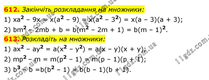 612. Закінчіть розкладання на множники: 1) ха2 – 9х = х(а2 – 9) = x(a2 – 32) = х(а – 3)(а + 3); 2) bm2 – 2mb + b = b(m2 – 2m + 1) = b(m – 1)2. 613. Розкладіть на множники: 1) ах2 – ау2 = а(х2 – у2) = а(х – у)(х + у); 2) mр2 – m = m(р2 – 1) = m(р – 1)(р + 1); 3) b3 – b =b(b2 – 1) = b(b – 1)(b + 1).