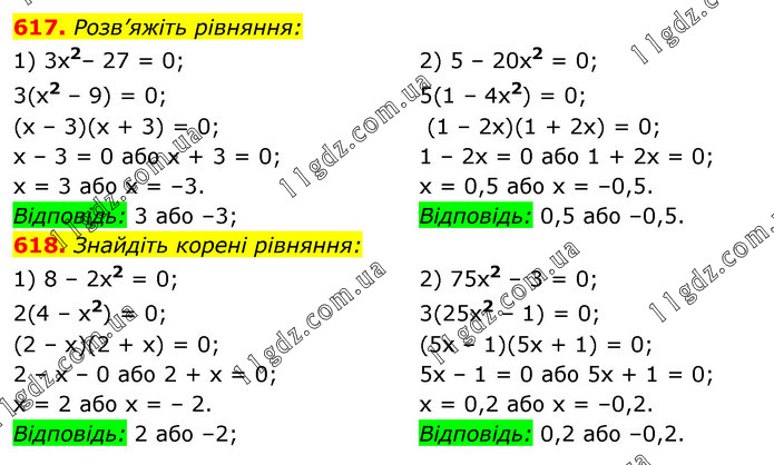 617. Розв’яжіть рівняння: 1) 3x2– 27 = 0; 3(x2 – 9) = 0; (x – 3)(x + 3) = 0; x – 3 = 0 або x + 3 = 0; x = 3 або x = –3. Відповідь: 3 або –3; 2) 5 – 20x2 = 0; 5(1 – 4x2) = 0; (1 – 2x)(1 + 2x) = 0; 1 – 2x = 0 або 1 + 2x = 0; x = 0,5 або x = –0,5. Відповідь: 0,5 або –0,5. 618. Знайдіть корені рівняння: 1) 8 – 2x2 = 0; 2(4 – x2) = 0; (2 – х)(2 + х) = 0; 2 – х – 0 або 2 + х = 0; х = 2 або х = – 2. Відповідь: 2 або –2; 2) 75x2 – 3 = 0; 3(25x2 – 1) = 0; (5х – 1)(5х + 1) = 0; 5х – 1 = 0 або 5x + 1 = 0; х = 0,2 або х = –0,2. Відповідь: 0,2 або –0,2.