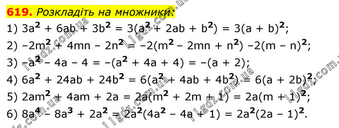 Розкладіть на множники: 1) 3а2 + 6аb + 3b2 = 3(а2 + 2аb + b2) = 3(а + b)2; 2) –2m2 + 4mn – 2n2 = –2(m2 – 2mn + n2) –2(m – n)2; 3) –a2 – 4a – 4 = –(а2 + 4а + 4) = –(а + 2); 4) 6а2 + 24аb + 24b2 = 6(а2 + 4ab + 4b2) = 6(а + 2b)2; 5) 2am2 + 4am + 2а = 2а(m2 + 2m + 1) = 2а(m + 1)2; 6) 8а4 – 8а3 + 2а2 = 2а2(4а2 – 4а + 1) = 2а2(2а – 1)2.