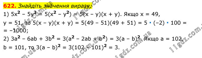 Знайдіть значення виразу: 1) 5х2 – 5у2 = 5(x2 – y2) = 5(х – у)(x + у). Якщо х = 49, у = 51, то 5(х – у)(х + у) = 5(49 – 51)(49 + 51) = 5 ∙ (–2) ∙ 100 = = –1000; 2) 3а2 – 6аb + 3b2 = 3(a2 – 2аb + b2) = 3(а – b)2. Якщо а = 102, b = 101, то 3(а – b)2 = 3(102 – 101)2 = 3.