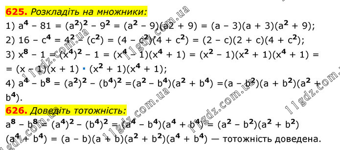 625. Розкладіть на множники: 1) a4 – 81 = (a2)2 – 92 = (a2 – 9)(a2 + 9) = (a – 3)(a + 3)(a2 + 9); 2) 16 – c4 = 42 – (c2) = (4 – c2)(4 + c2) = (2 – c)(2 + c)(4 + c2); 3) x8 – 1 = (x4)2 – 1 = (x4 – 1)(x4 + 1) = (x2 – 1)(x2 + 1)(x4 + 1) = = (x – 1)(x + 1) ∙ (x2 + 1)(x4 + 1); 4) a4 – b8 = (a2)2 – (b4)2 =(a2 – b4)(a2 + b4) =(a – b2)(a + b2)(a2 + b4). 626. Доведіть тотожність: a8 – b8 = (a4)2 – (b4)2 = (a4 – b4)(a4 + b4) = (a2 – b2)(a2 + b2) (a4 + b4) = (a – b)(a + b)(a2 + b2)(a4 + b4) — тотожність доведена.